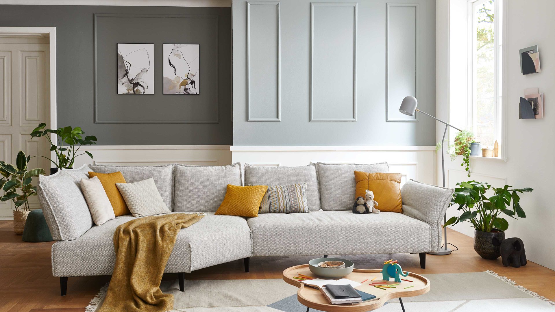 Zierkissen sowie weitere dargestellte Einrichtungsgegenstände sind separat gegen Mehrpreis bestellbar.