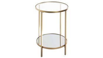 Der Beistelltisch ist mit seinem modernen und eleganten Design ein absoluter Hingucker. Er kombiniert ein goldfarben lackiertes Metallgestell mit zwei Ablagen: Die obere besteht aus Sicherheitsglas und die untere aus Spiegelglas. Dank der hochwertigen Materialien ist das Tischchen robust, widerstandsfähig und langlebig. Seine Maße belaufen sich auf ca. 55 x 39 cm (HxD).