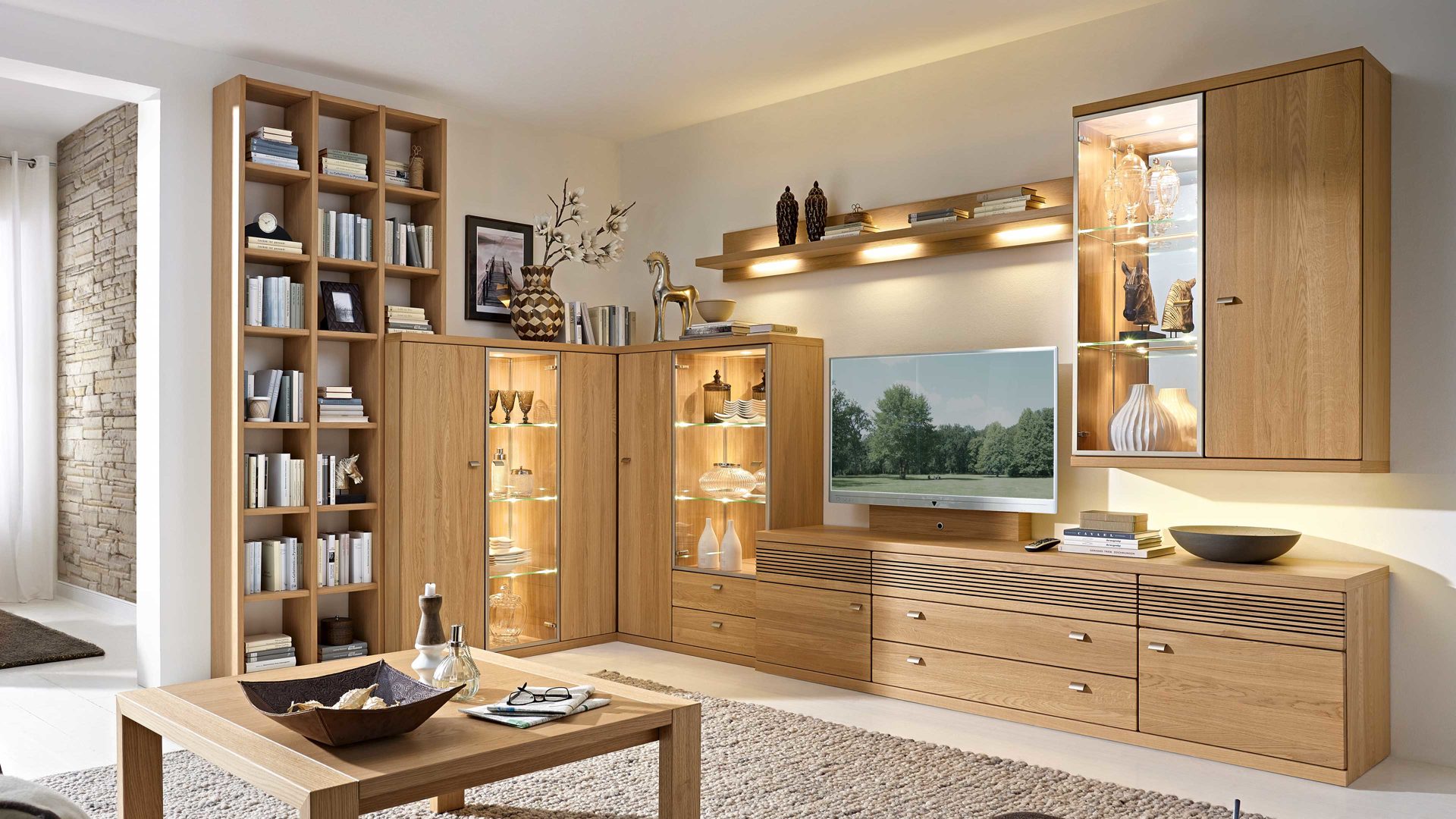 Die stilvoll gestaltete und erstklassig verarbeitete Wohnwand besteht aus einer Regalkombination, einem Stauraumelement, einem Vitrinenschrank, einem Lowboard, einem Wandboard und zwei Hängeschränken. Zur umfassenden, ca. 236 x 250 cm (BxH) großen Regalkombination gehören offene Bereiche für Bücher und Deko sowie zwei geschlossene Stauraumschränke. Das eintürige Stauraumelement beherbergt hinter der Holztür drei Einlegeböden und misst ca. 45 x 149 x 39 cm (BxHxT). Im ebenfalls eintürigen Vitrinenschrank mit Glastür warten zwei Glasböden. Hinzu kommen zwei Schubladen. Die Maße der Vitrine belaufen sich auf ca. 60 x 149 x 39 cm (BxHxT). Beim Lowboard mit speziellem Furn-Sound-System (Akustikblende und akustikwirksamer Innenausstattung) bieten Ihnen zwei Türen, zwei Schubladen und ein Soundbarfach jede Menge Raum zur Aufbewahrung Ihrer Gegenstände. Es misst ca. 225 x 52 x 49 cm (BxHxT). Auf dem ca. 240 x 25 x 23 cm (BxHxT) großen Wandboard mit Rückwand bringen Sie schöne Accessoires perfekt zur Geltung. Beide Hängeschränke sind eintürig. Während einer davon eine Glastür und zwei Glasböden offenbart, hat der andere eine Holztür und zwei Einlegeböden. Die zwei Schränke weisen dieselbe Größe auf, konkret ca. 45 x 131 x 35 cm (BxHxT). Insgesamt beträgt das Schenkelmaß der attraktiven Eck-Wohnwand ca. 236 x 407 cm (BxL, von links).