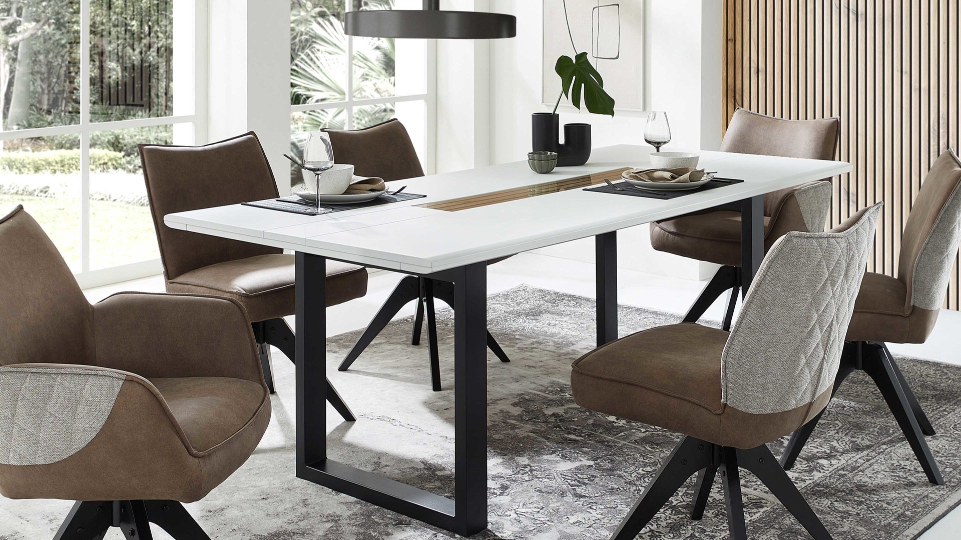 mattweiße Oberflächen, kombiniert mit Artisan Eiche-Nachbildung und grauem Parsolglas
