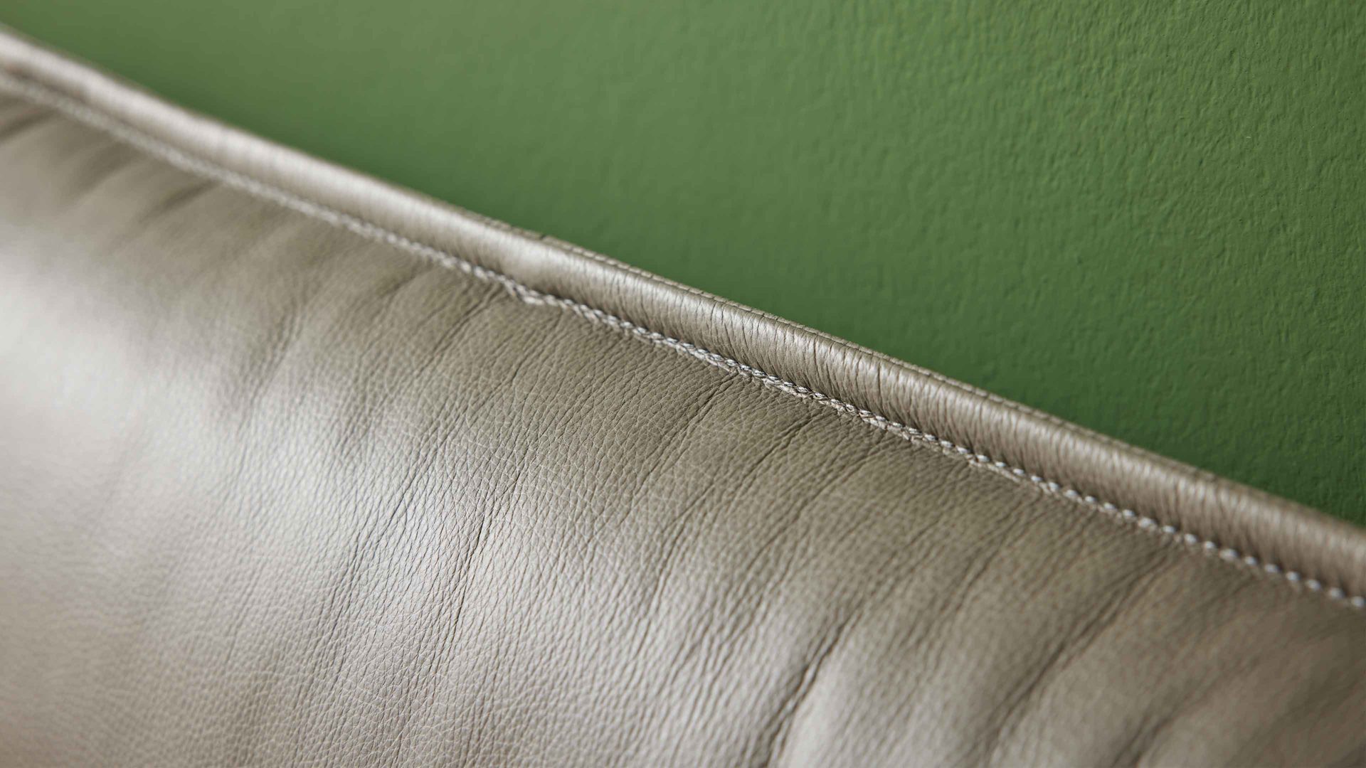 Ein elegantes Highlight ist das geteilte Polsterkopfteil, das mit einem umlaufenden Keder und einer Rückseite im Originalstoff überzeugt. Damit eignet sich das Bett perfekt auch für eine freistehende Platzierung im Raum – ideal für moderne Schlafzimmer mit offenem Wohncharakter.