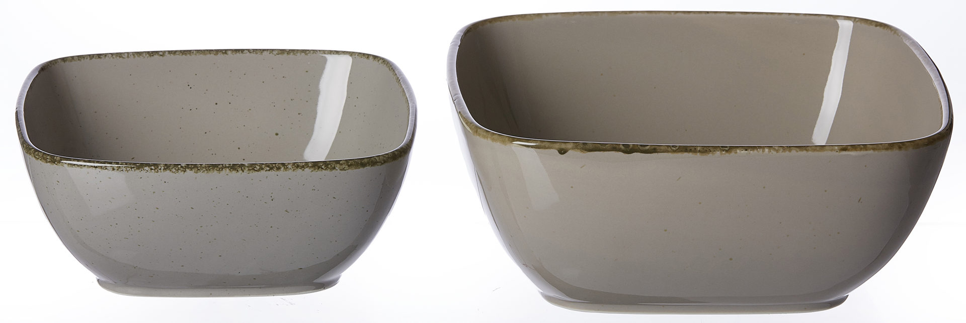 Es handelt sich um ein zweiteiliges Set, das sich aus einer größeren und einer kleineren quadratischen Schüssel zusammensetzt. Ca. 22 x 9 x 22 cm (BxHxT) misst die große Schale, während die Maße der kleinen Porzellanschüssel ca. 18 x 8 x 18 cm (BxHxT) betragen.