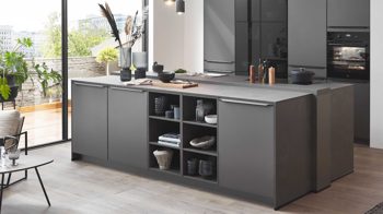 Die nobilia® Einbauküche Laser kombiniert mattes Vulkangrau als absolute Trendfarbe mit attraktiven Akzenten aus Schwarzglas.