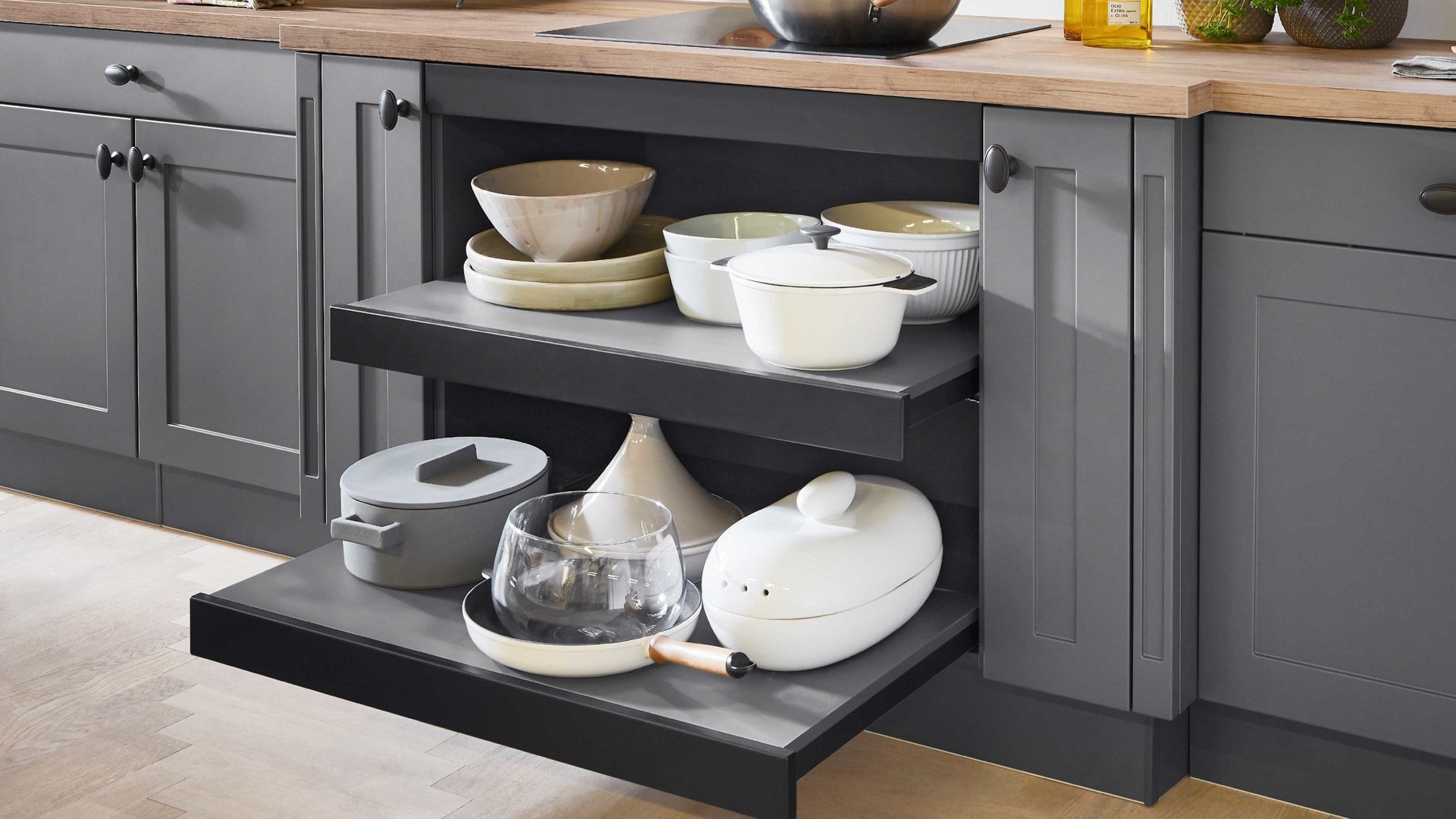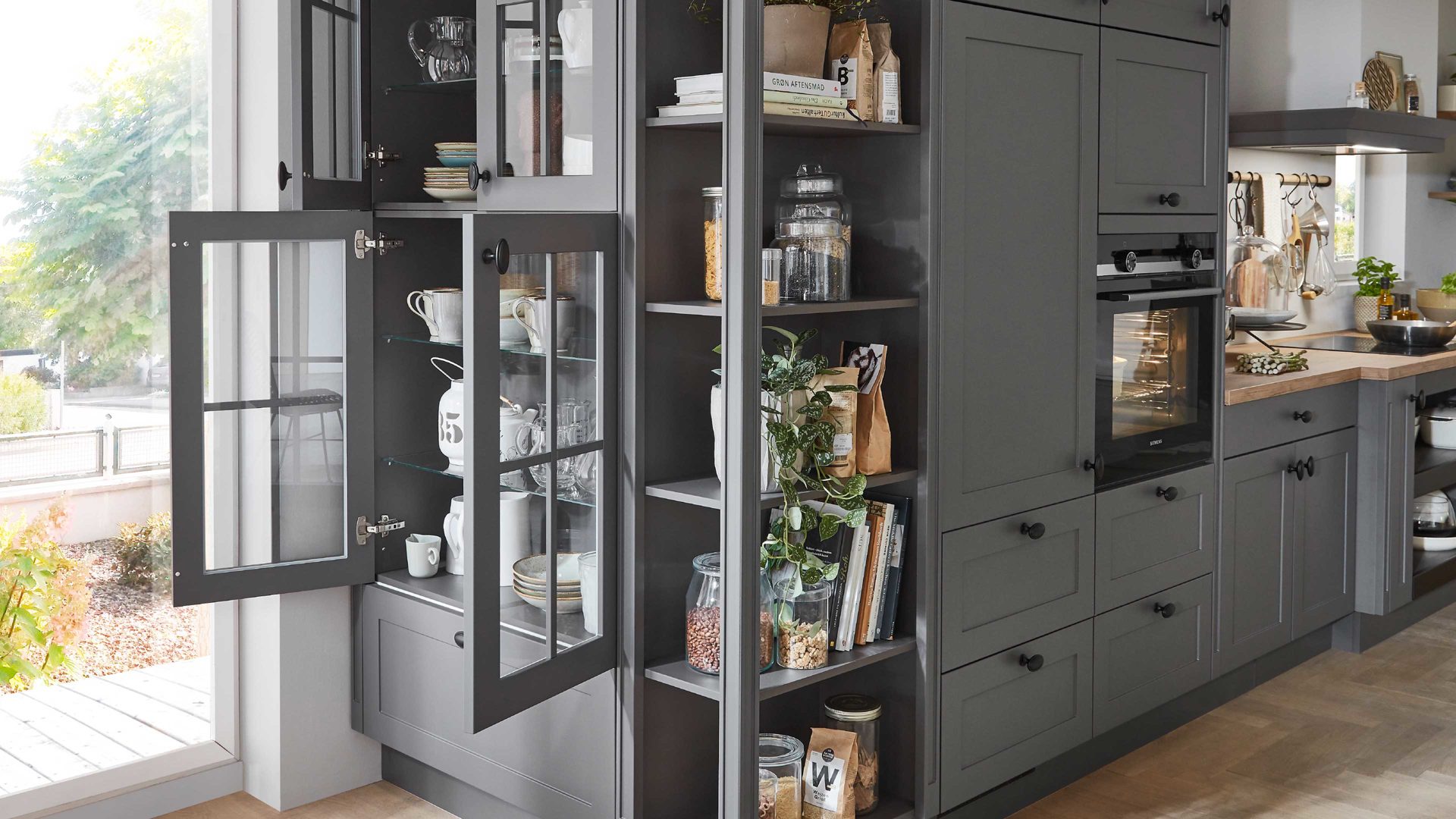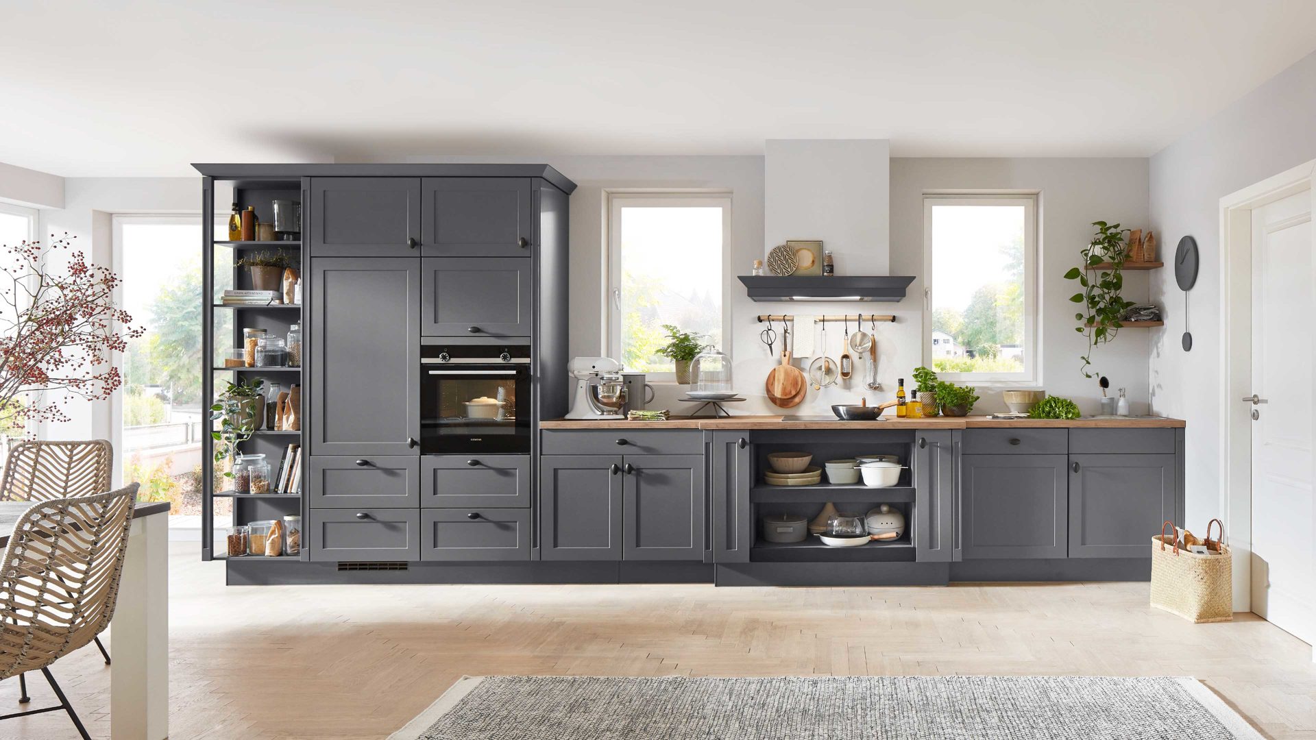 Die nobilia® Einbauküche Nordic kombiniert mattes Schiefergrau als echte Trendfarbe mit einer Arbeitsplatte in Taxus-Nachbildung, die warmen Naturcharme verströmt.