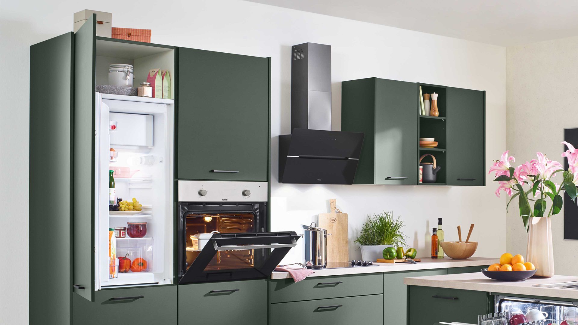 mattes Dunkelgrün, zementfarbene Arbeitsplatten und schwarze Sockelblenden
