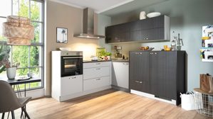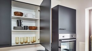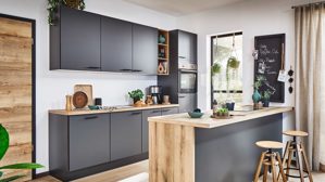 supermattes Grafit und Evoke Eiche-Nachbildung, kombiniert mit schwarzen Bügelgriffen und Arbeitsplatten in Evoke Eiche-Nachbildung