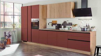 Die EXPRESS KÜCHEN Einbauküche Win mit Einbaugeräten kombiniert Fronten in mattem Karminrot mit anthrazitfarbenen Sockelblenden und einer Arbeitsplatte in ebenfalls anthrazitfarbener Steinstruktur-Nachbildung. Diese beiden perfekt aufeinander abgestimmten Farben zieren auch die Sichtseiten. Puristische edelstahlfarbene Bügelgriffe runden die moderne und elegante Optik der Planküche stilsicher ab.