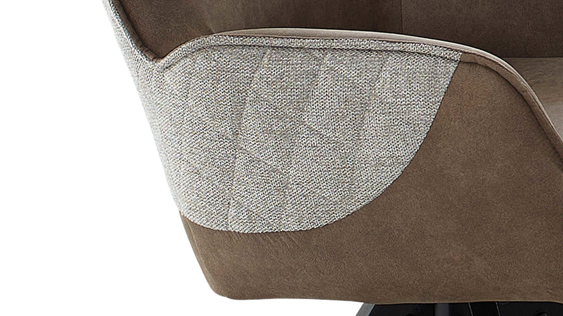brauner Stoffbezug im Antikleder-Look, kombiniert mit beige-braun meliertem Stoffbezug mit Rautensteppung und mattschwarzem Metall