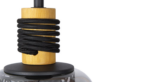 die Fassungen sind in naturfarbenes Holz eingelassen, die mit schwarzem Textilkabel umwickelt sind