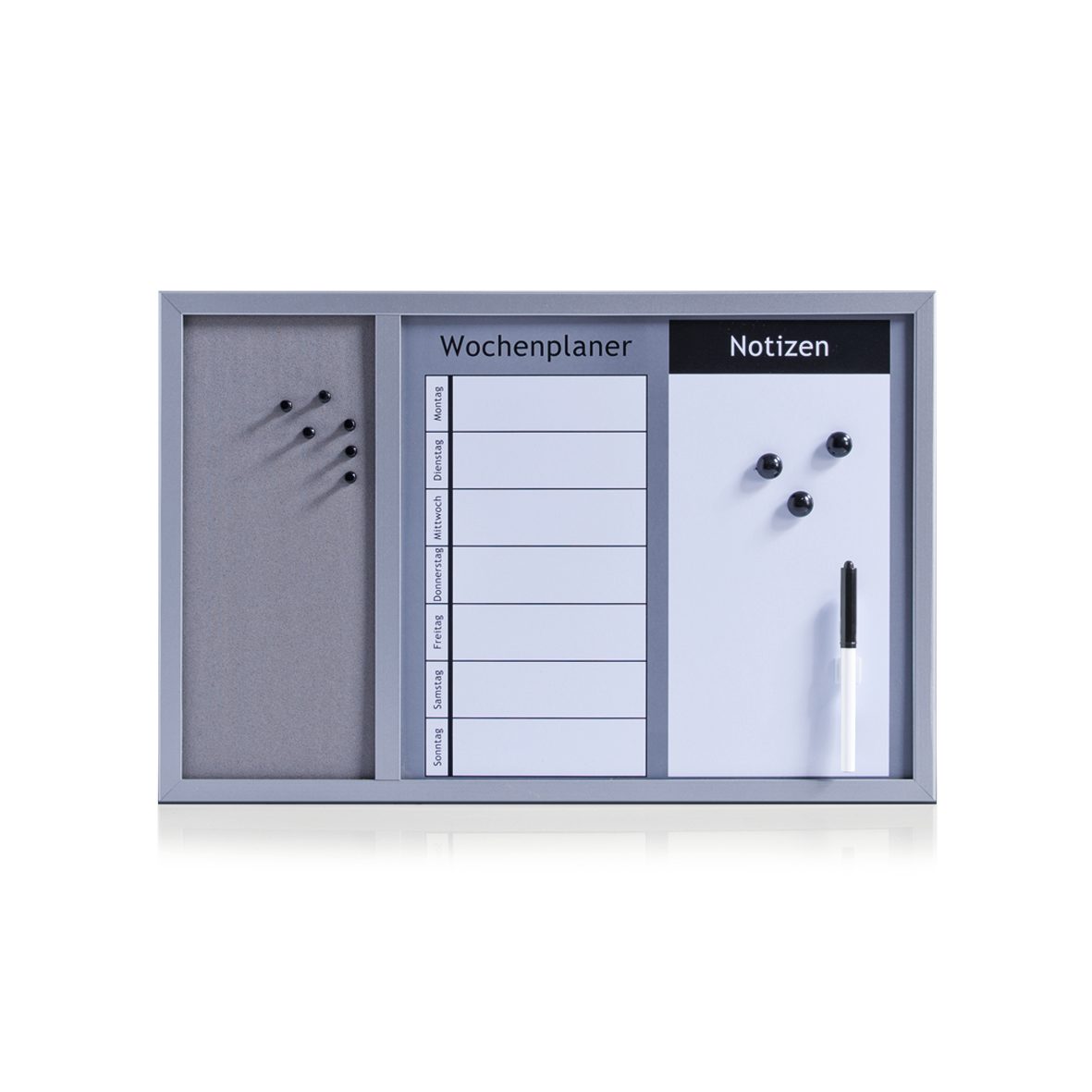 Diese ca. 60 x 40 cm (BxT) große Tafel ist eine klassische Pinnwand, ein Wochenplaner und ein Memoboard zugleich. Die letztgenannten Flächen können ebenfalls als Magnettafel verwendet werden. Hierzu liegen drei Magnete bei, ebenso wie ein Filzstift inklusive Halterung und Pins.