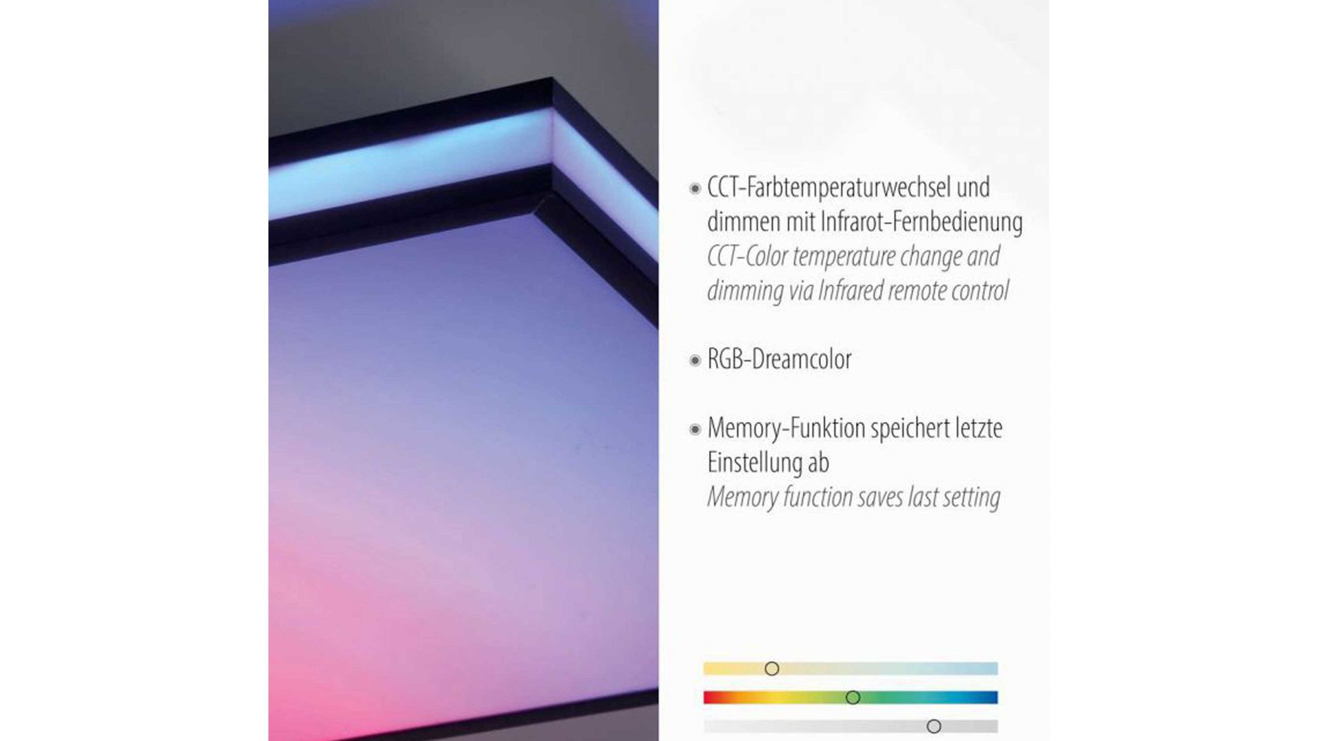 | Verstellbarkeit und Funktion: | dimmbar Fernbedienung CCT | Lichtmanagement Memoryfunktion Farbwechsler | |