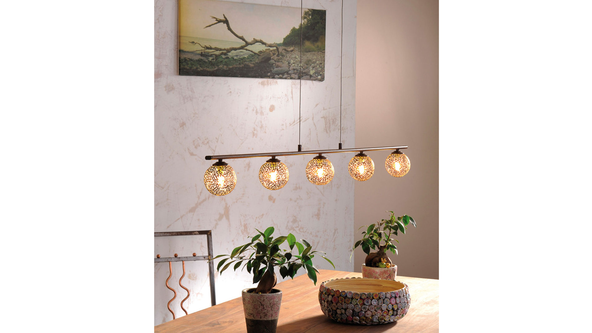 Die elegante Hängelampe besteht aus rostfarbenem Metall, kombiniert mit goldfarbenen Lampenschirmen, und wertet daher jedes Raumkonzept auf. Mit Maßen von ca. 132 x 150 x 9 cm (LxHxT) passt die Pendellampe hervorragend über jeden Esstisch und sorgt dort für stimmungsvolles Licht bei jedem Anlass. Egal ob Spieleabend oder gemeinsames Abendessen mit Freunden oder der Familie – die Pendelleuchte Greta erntet bewundernde Blicke von Ihren Gästen.