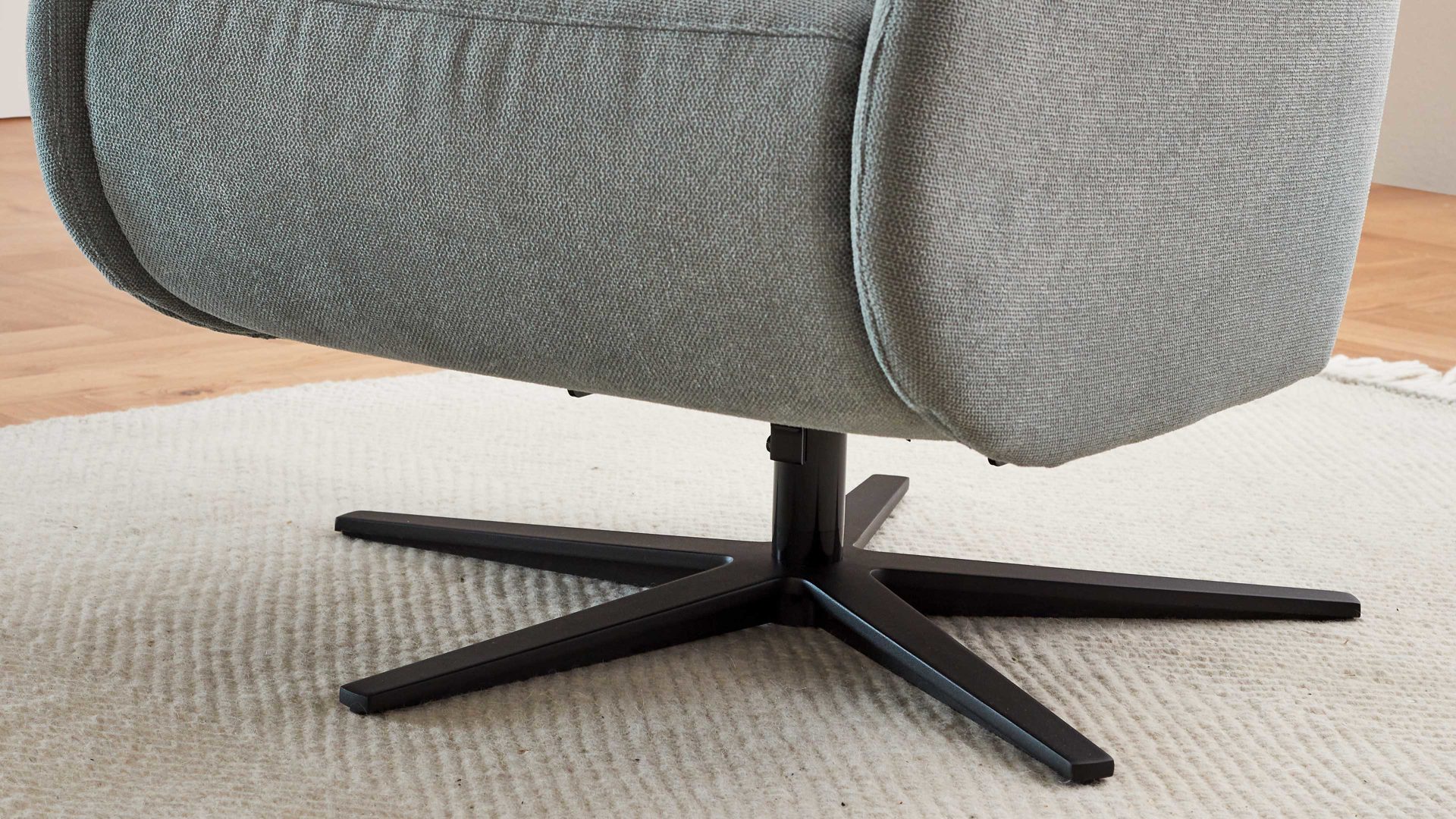Der trendige COMFORT SMART Polstersessel Calipso kombiniert einen salbeifarbenen Strukturbezug mit einem mattschwarzen Sternfuß aus Metall.