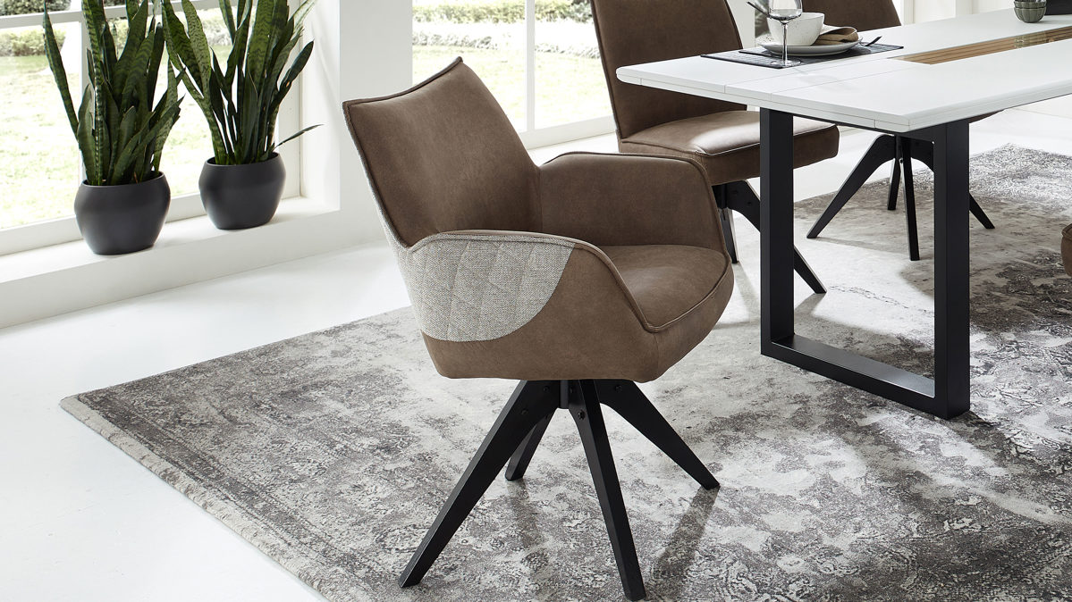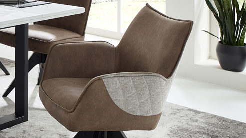 brauner Stoffbezug im Antikleder-Look, kombiniert mit beige-braun meliertem Stoffbezug mit Rautensteppung und mattschwarzem Metall