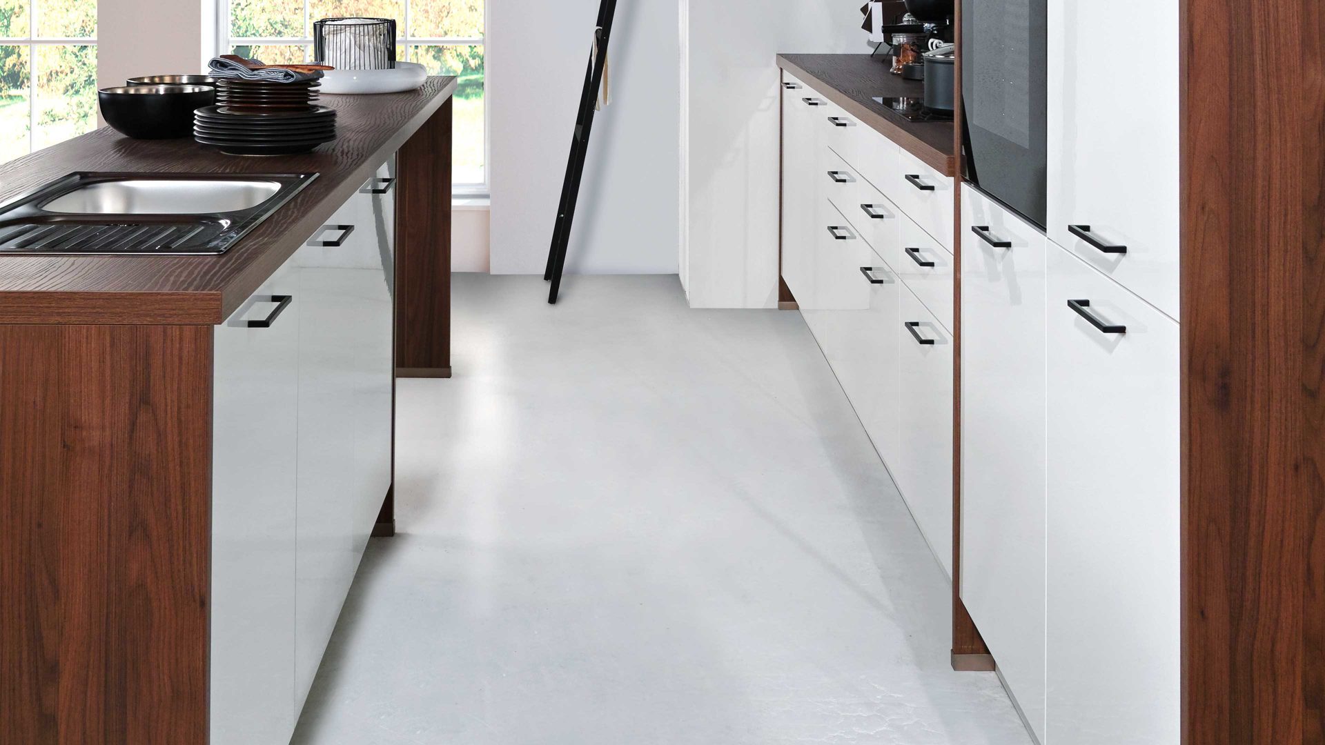Die zweizeilige EXPRESS KÜCHEN Einbauküche Star mit Markengeräten kombiniert weiße Lacklaminat-Hochglanzfronten mit Korpussen, Sichtseiten, Arbeitsplatten, Regalen und einem Ansetztisch in graubrauner Eiche-Nachbildung. Schlichte Bügelgriffe runden die moderne und elegante Optik der Planküche stilsicher ab.