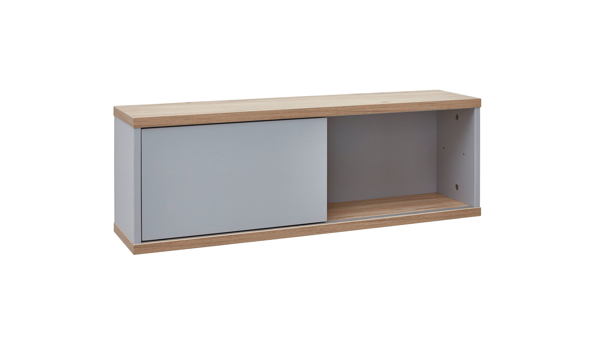 Funktional überzeugt das erstklassig verarbeitete Regal mit einem großen Fach rechts sowie einem durch einen Einlegeboden unterteilten Bereich linksseitig. Die praktische Schiebetür lässt sich komplett von links nach rechts durchschieben. Es steht demnach offener und halbgeschlossener Stauraum für verschiedene Gegenstände zur Verfügung, etwa Spielsachen, Bücher und Zeitschriften, Fotoalben, CDs, DVDs und Blu-Rays oder andere Utensilien, die entweder vor Licht und Staub geschützt oder dekorativ sichtbar aufbewahrt werden sollen. Auf ca. 86 x 29 x 20 cm (BxHxL) belaufen sich die Maße des praktischen Regalelements.