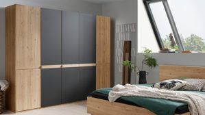 mattes Graphit, kombiniert mit biancofarbener Eiche Nachbildung und mattschwarzen Griffen