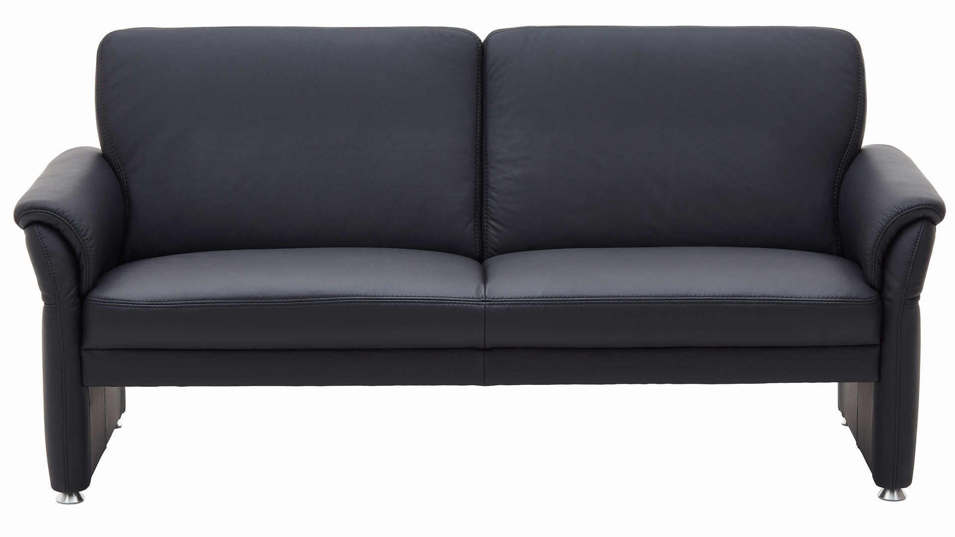 Mit den stabilen Aluminiumfüßen und dem klassisch-schwarzen Lederbezug strahlt dieser Dreisitzer moderne Eleganz aus. Die Materialien und Farben harmonieren hervorragend miteinander. Dank ihrer Zeitlosigkeit fügen sie sich in verschiedene Einrichtungskonzepte absolut stimmig ein. Die Maße der Ledercouch belaufen sich auf ca. 185 x 90 x 85 cm (LxHxT), bei einer Sitzhöhe von ca. 46 cm und einer Sitztiefe von ca. 53 cm.