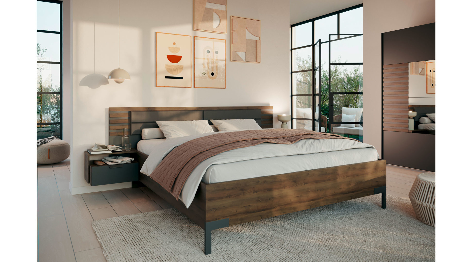 • Die Abbildung zeigt ein Wohnbeispiel, welches auch Dekoration sowie separat erhältliches Zubehör enthält. Im Lieferumfang enthalten ist eine Bettanlage mit Hängenachttischen.
