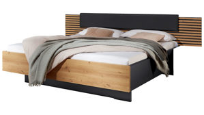 Doppelbettgestell mit Rauchglasböden im überstehenden Holz-Kopfteil