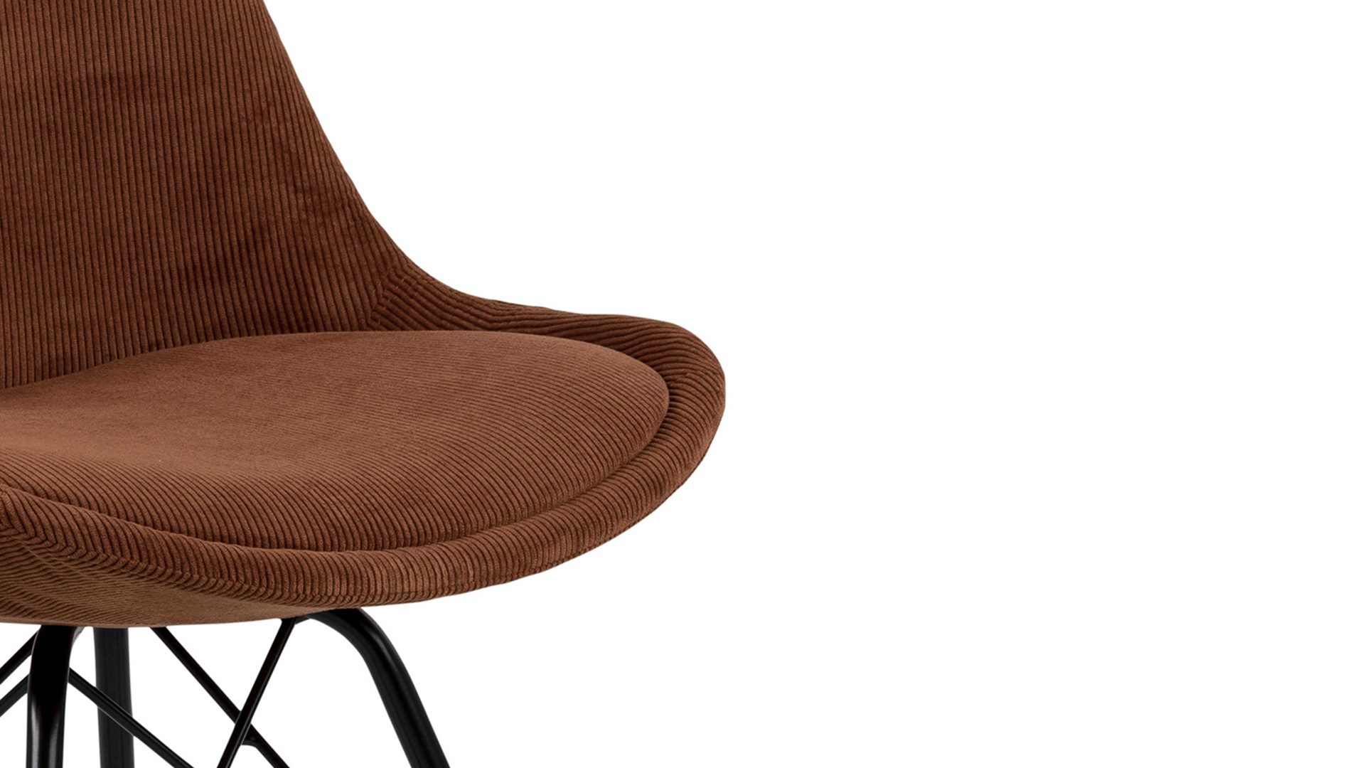 Als stabile, dabei aber wunderbar filigran designte Basis fungiert ein mattschwarz pulverbeschichtetes Stahldrahtgestell. Darauf befindet sich eine kupferfarbene Sitzschale aus robustem Kunststoff. Sie ist rundherum mit Feincord bezogen, ebenfalls in Kupfer. Der angesagte Feincordbezug überzeugt sowohl qualitativ als auch optisch und haptisch.
