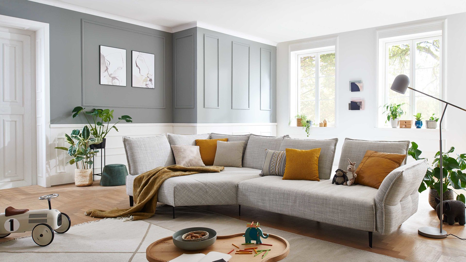 Zierkissen sowie weitere dargestellte Einrichtungsgegenstände sind separat gegen Mehrpreis bestellbar.