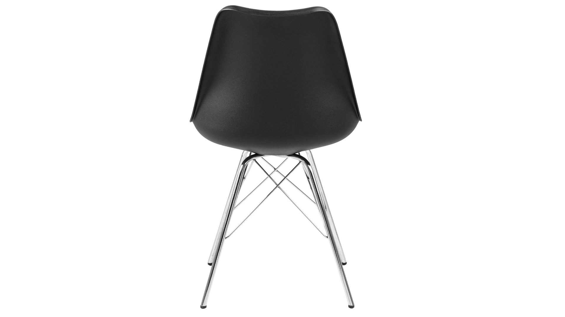 Dieser Polsterstuhl verkörpert puristische Eleganz. Als stabile, dabei aber wunderbar filigran designte Basis fungiert ein verchromtes Stahldrahtgestell. Darauf befindet sich eine schwarze Sitzschale aus robustem Kunststoff. Sie ist rundherum mit schwarzem Kunstleder bezogen, das sowohl qualitativ als auch optisch und haptisch überzeugt. Die Farbgebung sorgt für eine klassisch-schlichte Ausstrahlung.