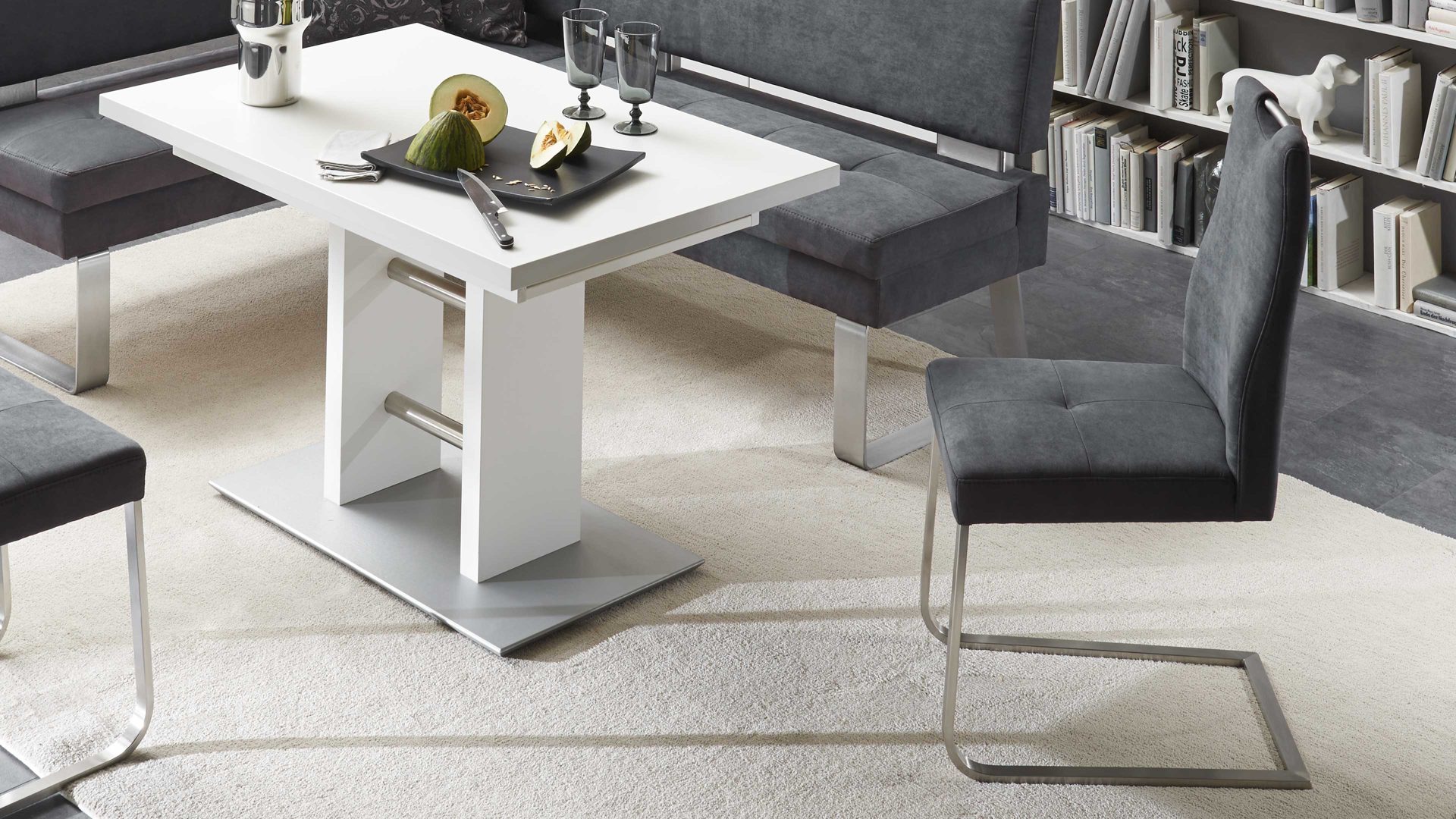 Auch optisch macht der Freischwinger einiges her. Als stabilisierende Basis fungiert ein klassisches Edelstahlgestell. Es harmoniert bestens mit dem soften Mikrofaserbezug im modernen Farbton Anthrazit. Stilsicher abgerundet wird der Combinessa Polsterstuhl Genesis durch die akzentuierende Steppung der Sitzfläche.