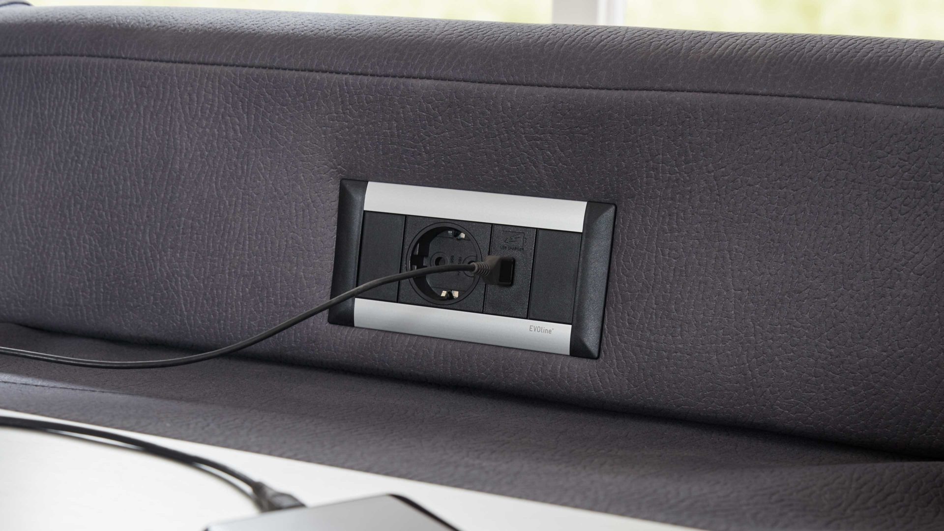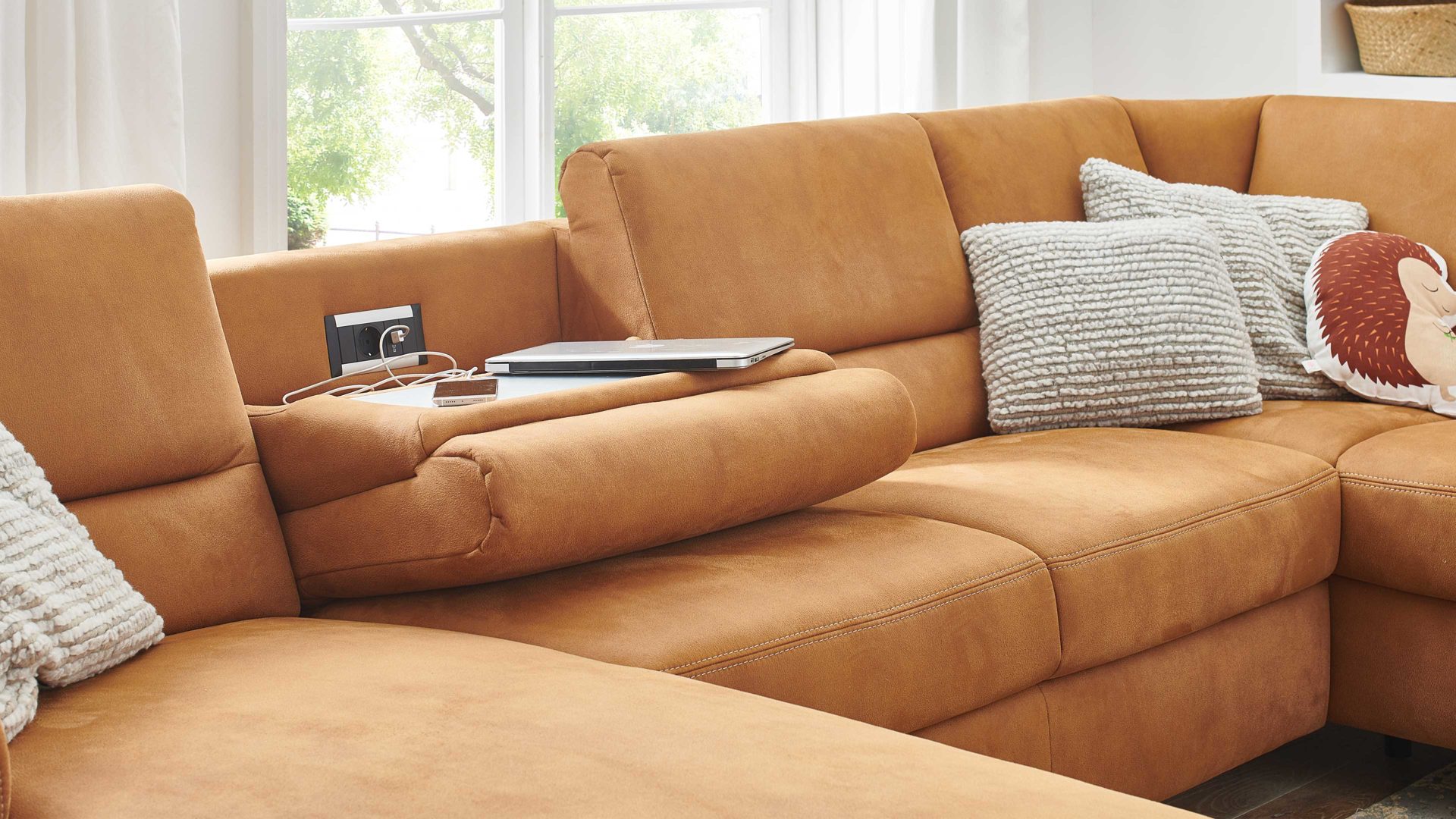 Auf der Rückseite des jeweiligen Rückenpolsters ist eine aluminiumfarbene Ablageplatte in den Bezug eingearbeitet - sie greift den Ton der Couchfüße noch einmal auf und sorgt dadurch für ein harmonisches Gesamtbild. Indem Sie das Rückenpolster nach vorne klappen, schaffen Sie eine praktische Ablagefläche samt Steckdose und USB-Anschluss.