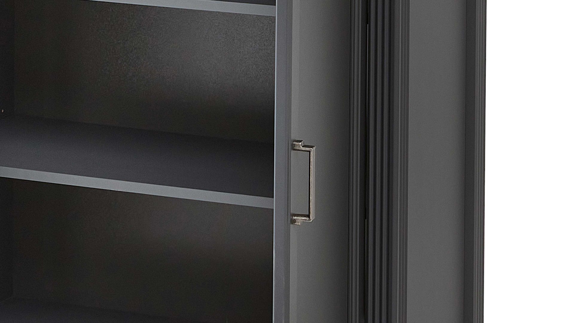 Die Türenkommode ist im angesagten Landhausstil designt. Front und Korpus sind in edlem Graphit gehalten, während sich der Oberboden in Artisan-Eiche-Nachbildung präsentiert. Durch die gelungene Farbkombination strahlt die Kommode hochwertige Eleganz aus. Für das gewisse Etwas sorgen die antikfarbenen Metall-Muschelgriffe. Wiederum graphitfarbene Füße runden den Look harmonisch ab.