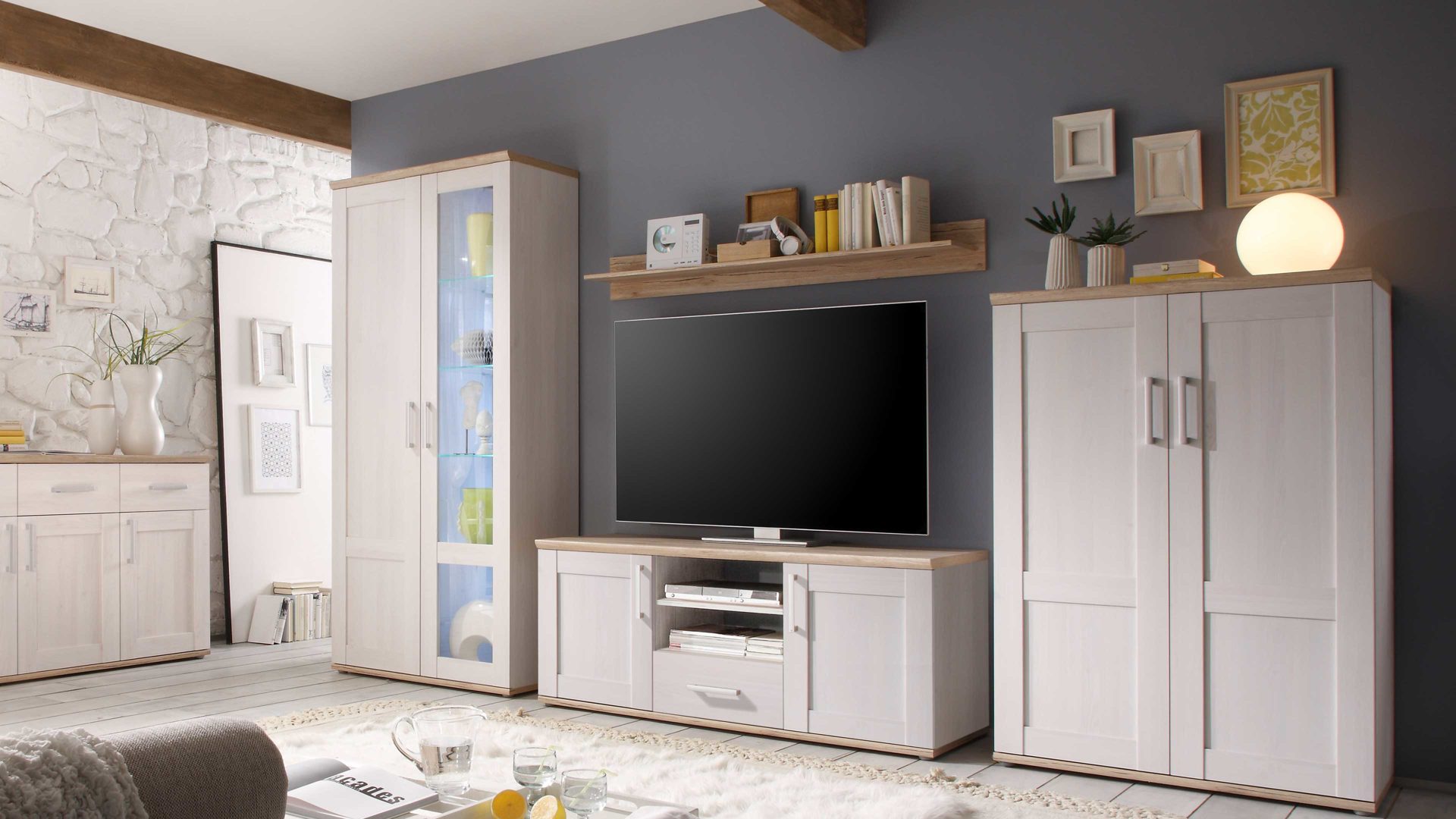 Ein Einrichtungstraum im skandinavischen Landhausstil ist diese vierteilige Wohnwand, die Maße von ca. 329 x 200 x 50 cm (BxHxT) aufweist. Gefertigt wurde sie aus Sibiu Lärche-Nachbildung in Kombination mit hellen San Remo Kunststoffoberflächen. Ein stattlicher Vitrinenschrank mit einer Holztür sowie einer Glastür, Maße ca. 93 x 202 x 46 cm (BxHxT), wird zum Blickfang der Wohnkombination. In seinem Inneren verbergen sich vier Glas- sowie vier Holzböden. Kaltweiße LED-Beleuchtung setzt die Glasböden der Vitrine geschmackvoll in Szene. Ein Wandboard mit Rückwand, Maße ca. 143 x 17 x 24 cm (BxHxT), kann als Abstellfläche für Bücher, DVDs oder Dekoaccessoires genutzt werden.