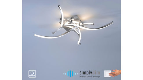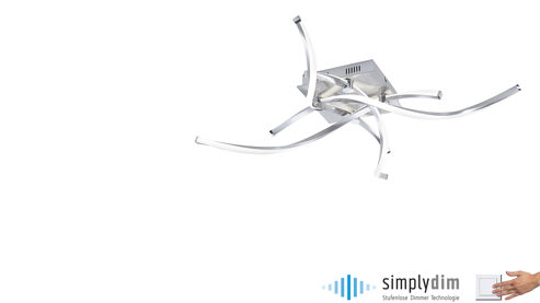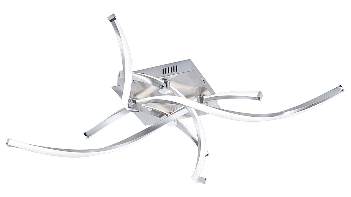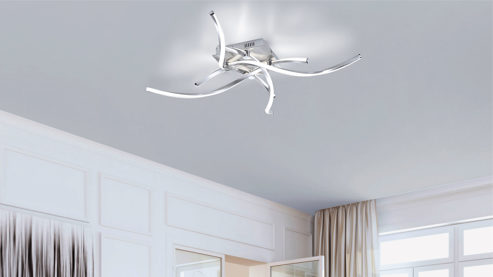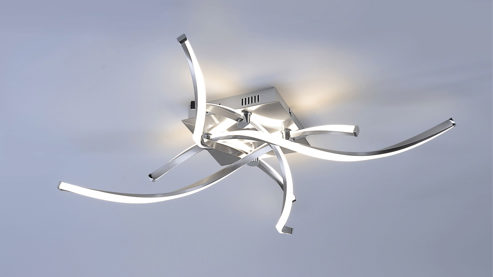 An der Deckenplatte der Lampe aus Stahl befinden sich formschöne und beleuchtete Lampenarme, die sich überkreuzen. Zudem sind die einzelnen Stangen gedreht und bestehen auf der einen Seite aus Acryl, wodurch das Licht besonders schön strahlt und ein herrliches Ambiente erzeugt.