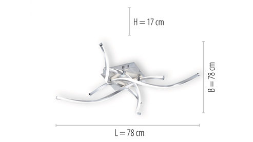 Mit einem Durchmesser von ca. 80 cm und einer Höhe von ca. 14 cm hängt die LED-Deckenleuchte Polina an der Decke in Ihrem Wohnbereich. Auch im Schlafzimmer ist die ausgefallene Leuchte eine stilvolle Ergänzung zu Ihrer Einrichtung. Im Lieferumfang enthalten sind die vier LED-Boards mit jeweils 7,75 Watt, 3360 Lumen und 3.000 Kelvin. Das Leuchtmittel entspricht der Energieeffizienzklasse E (Spektrum A bis G).