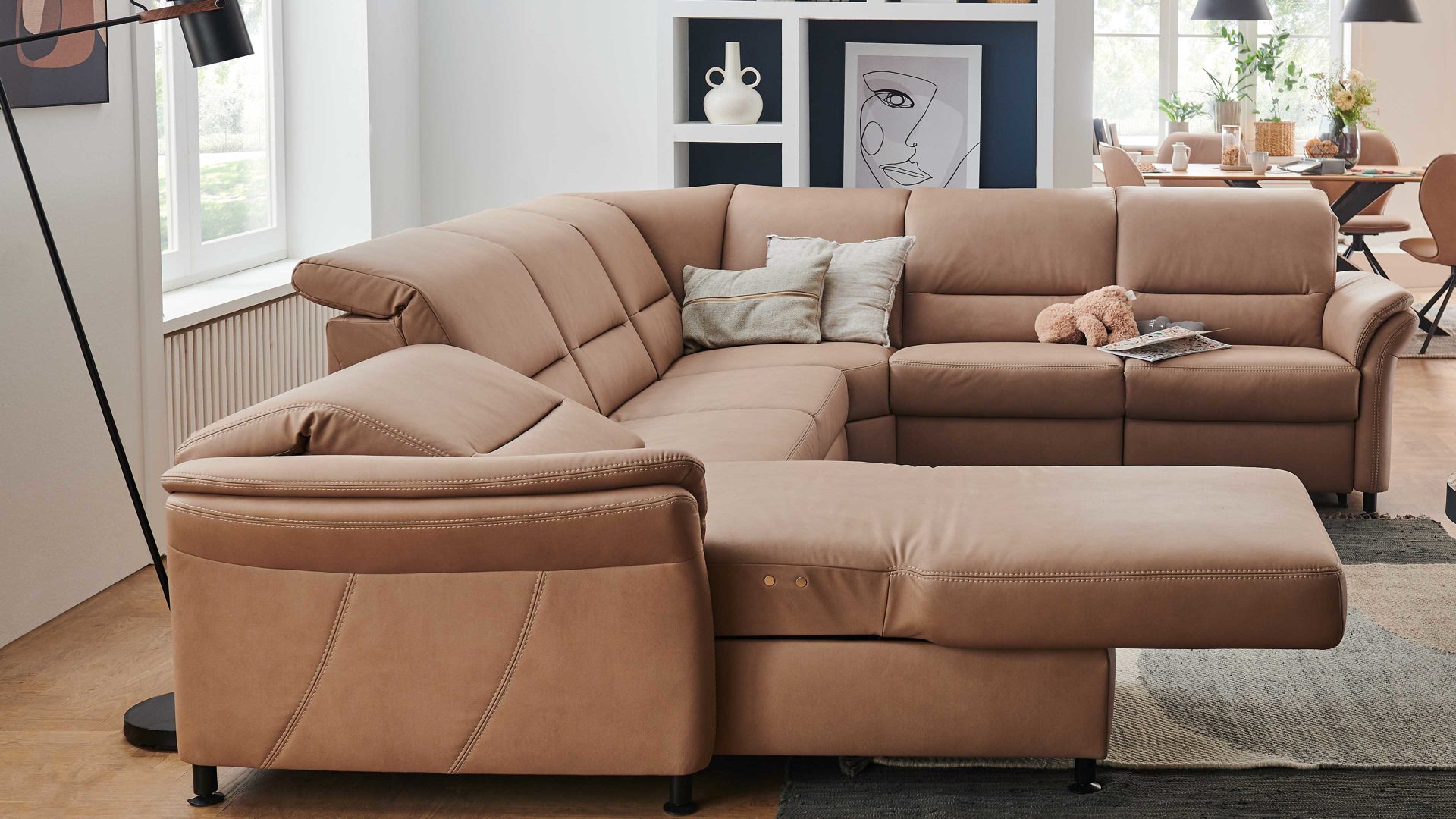 • Die Abbildung zeigt ein Wohnbeispiel, welches auch Dekoration sowie separat erhältliches Zubehör enthält. Im Lieferumfang enthalten ist eine motorische Relaxfunktion ohne Kopfteilverstellung.