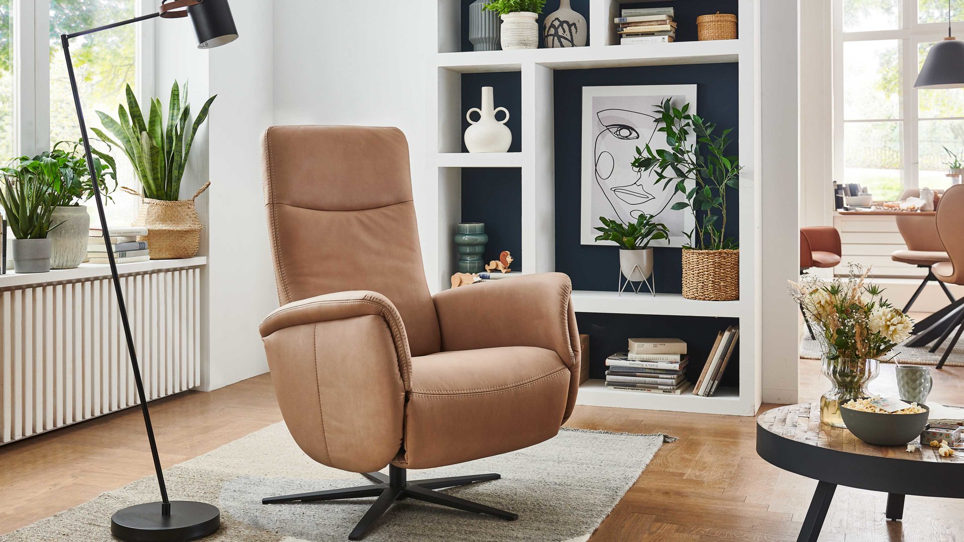 Mit dem camelfarbenen Mikrofaserbezug Galero samt beigefarbener Kontrastnaht und dem mattschwarzen Aluminium-Sternfuß V1S strahlt der Relaxsessel 1DRF aus dem großen Modulmaster Programm MM-ZE1062 moderne Eleganz aus.