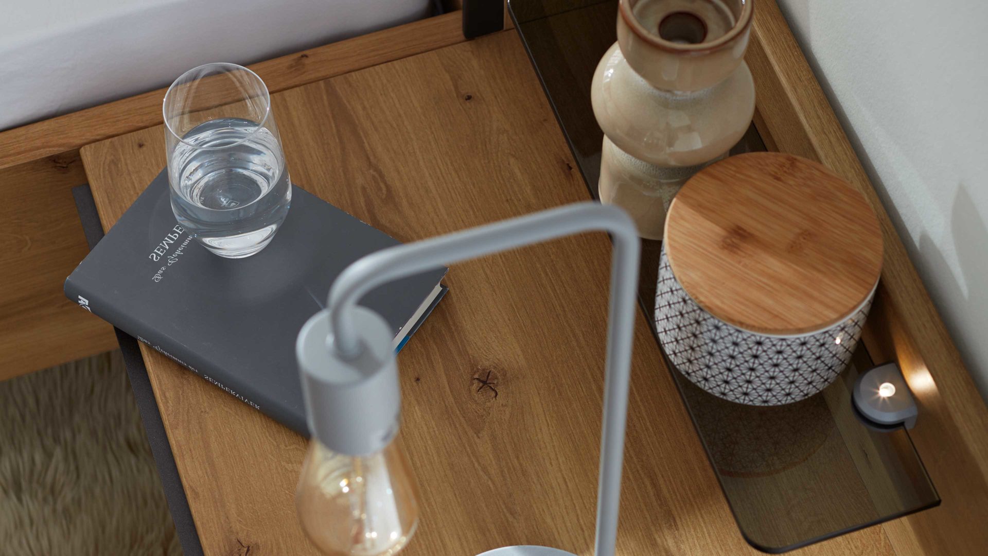Natürlich & modern zugleich: Die Kombination aus Bianco Eiche Nachbildung und einer edlen Rauchglasablage sorgt für warme, zeitgemäße Leichtigkeit. Das Paneel harmoniert perfekt mit weiteren Möbeln der Serie 1205 und fügt sich nahtlos in unterschiedliche Schlafzimmerstile ein.