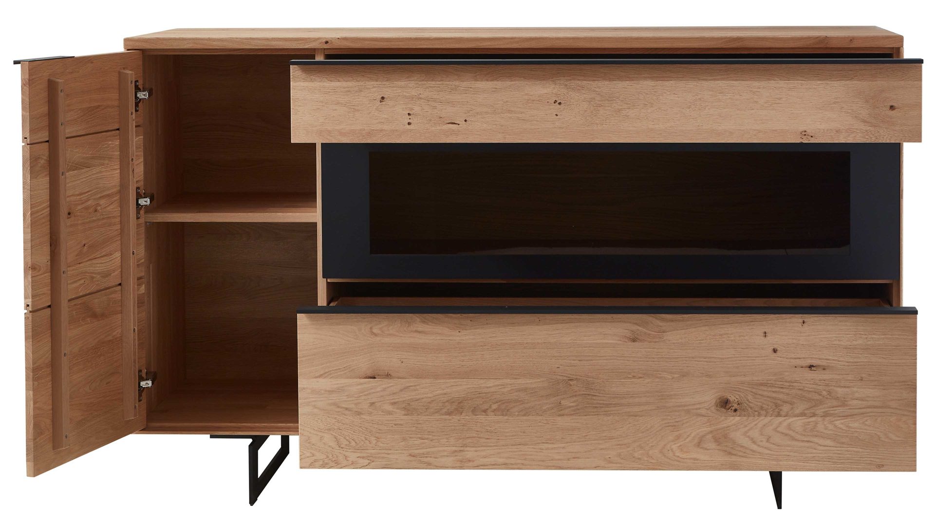 rechts eine Schublade, eine Klapptür, ein Auszug