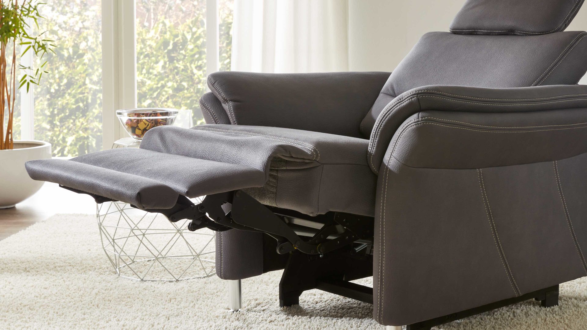 Hier die genaue Funktionsweise von WallAway: Während die Beinauflage auf Sitzhöhe fährt, bewegt sich der Sitz noch einige Zentimeter nach oben und vorne, sodass Sie sich von Kopf bis Fuß in eine komfortable Relaxposition begeben können. Diese lässt sich bis zur Liegeposition verstellen. Der Grund für die Bezeichnung der Funktion ist, dass der Rücken stets wandfrei bleibt. Demnach kann das jeweilige Möbel problemlos an seinem gewöhnlichen Standort bleiben und muss nicht vorgezogen werden.