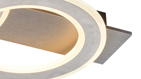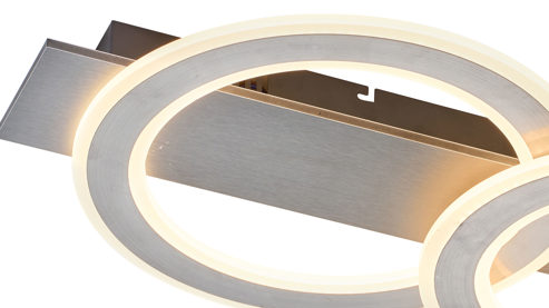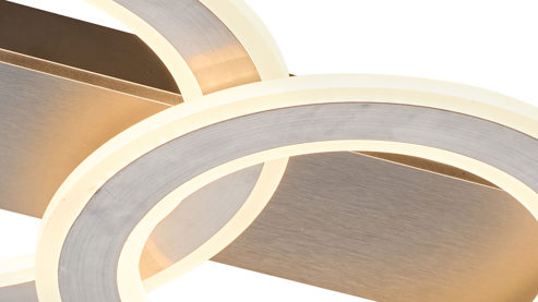 drei aufgesetzte grau gebürstete Metall-Lampenschirme, kombiniert mit opalfarbenem Acryl