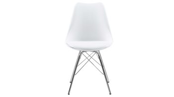Dieser Polsterstuhl verkörpert puristische Eleganz. Als stabile, dabei aber wunderbar filigran designte Basis fungiert ein verchromtes Stahldrahtgestell. Darauf befindet sich eine weiße Sitzschale aus robustem Kunststoff. Sie ist rundherum mit weißem Kunstleder bezogen, das sowohl qualitativ als auch optisch und haptisch überzeugt. Die Farbgebung sorgt für eine klassisch-schlichte Ausstrahlung.