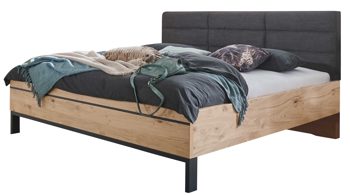 Die Kombination besteht aus einem 6-türigen Kleiderschrank, der durch eine Bauchbinde aus Riffholz und Leisten in Anthrazit besonders hervorsticht. Der Kleiderschrank bietet ausreichend Stauraum für Ihre Kleidung und Accessoires. Das Doppelbettgestell mit einer Liegefläche von ca. 180 x 200 cm verfügt über ein anthrazitfarbenes Polsterkopf- und Fußteil mit Winkelfuß und Leiste. Dies sorgt nicht nur für einen angenehmen Schlafkomfort, sondern auch für eine moderne Optik. Zusätzlich sind zwei Hängenachtkommoden im Lieferumfang enthalten.