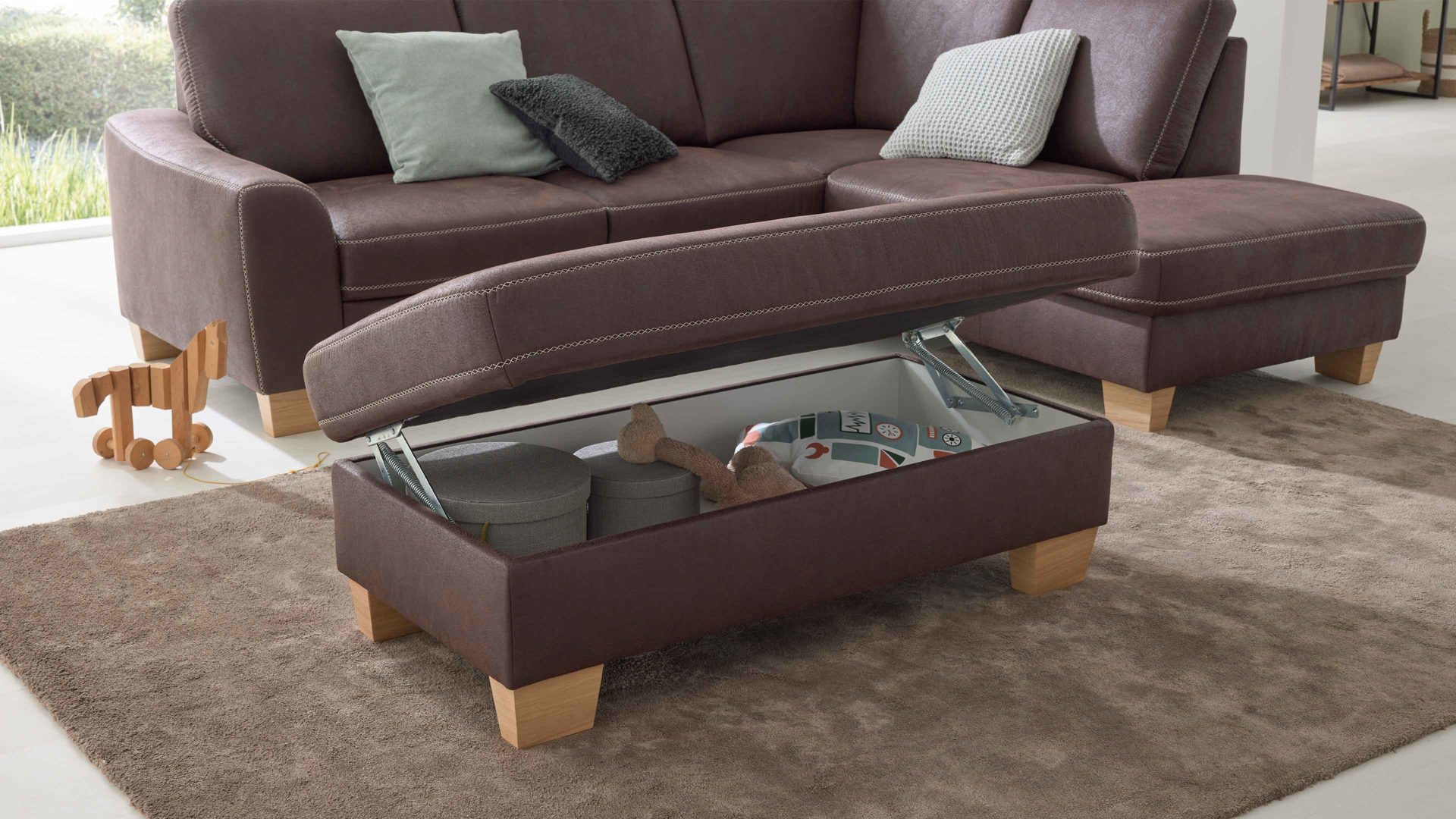 Für angenehmen Sitzkomfort sorgt die softe Kaltschaumpolsterung auf einer perfekt stützenden Wellenunterfederung. Der aufklappbare Stauraum ist innen weiß beschichtet und eignet sich zur Aufbewahrung von Wohntextilien, Spielsachen und anderen Gegenständen.