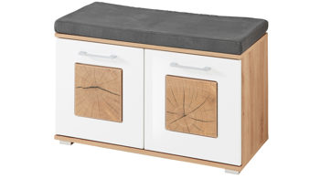 Die Dielenbank beherbergt zwei Holztüren. Innen befinden sich zwei Fachböden für insgesamt vier Fächer. Zudem kommt die Bank mit einem Sitzkissen daher, das mit stahlgrauem Stoff bezogen und mit Schaumstoff gefüllt ist. Die Maße der Garderobenbank belaufen sich auf ca. 84 x 53 x 38 cm (BxHxT).