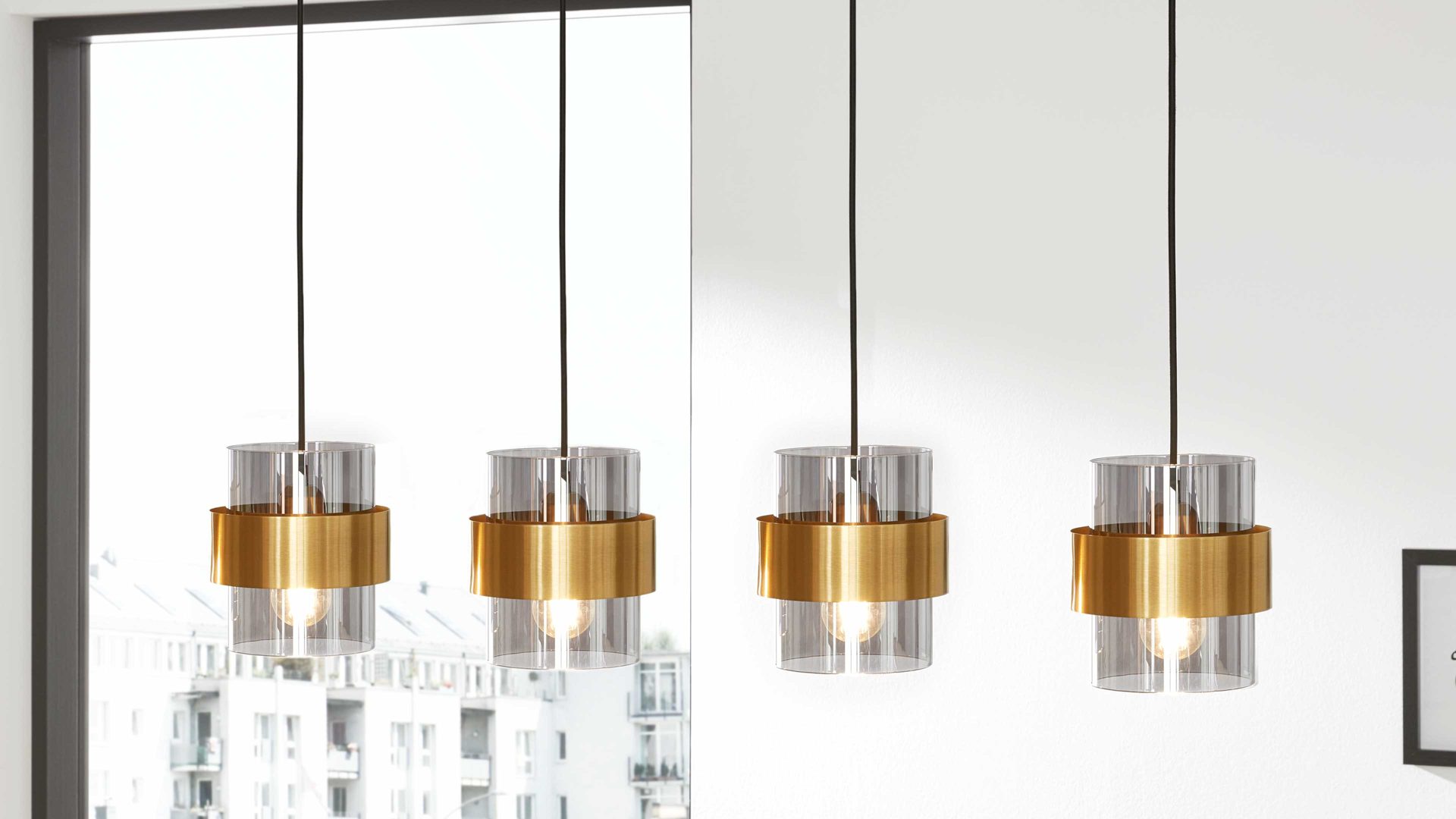 Die Hängeleuchte Interliving Leuchten Serie 9333 vereint moderne Eleganz mit einem Hauch Extravaganz und setzt deinen Essbereich eindrucksvoll in Szene. Die Kombination aus einer klassisch mattschwarzen Metallbasis und vier rauchfarbenen Glasschirmen, die von gebürsteten messingfarbenen Metallringen umrahmt werden, schafft ein stilvolles Gesamtbild. So entsteht ein harmonisches Zusammenspiel aus kühlem Metall und warmen Akzenten – ideal für ein wohnliches Lichtambiente mit Charakter.