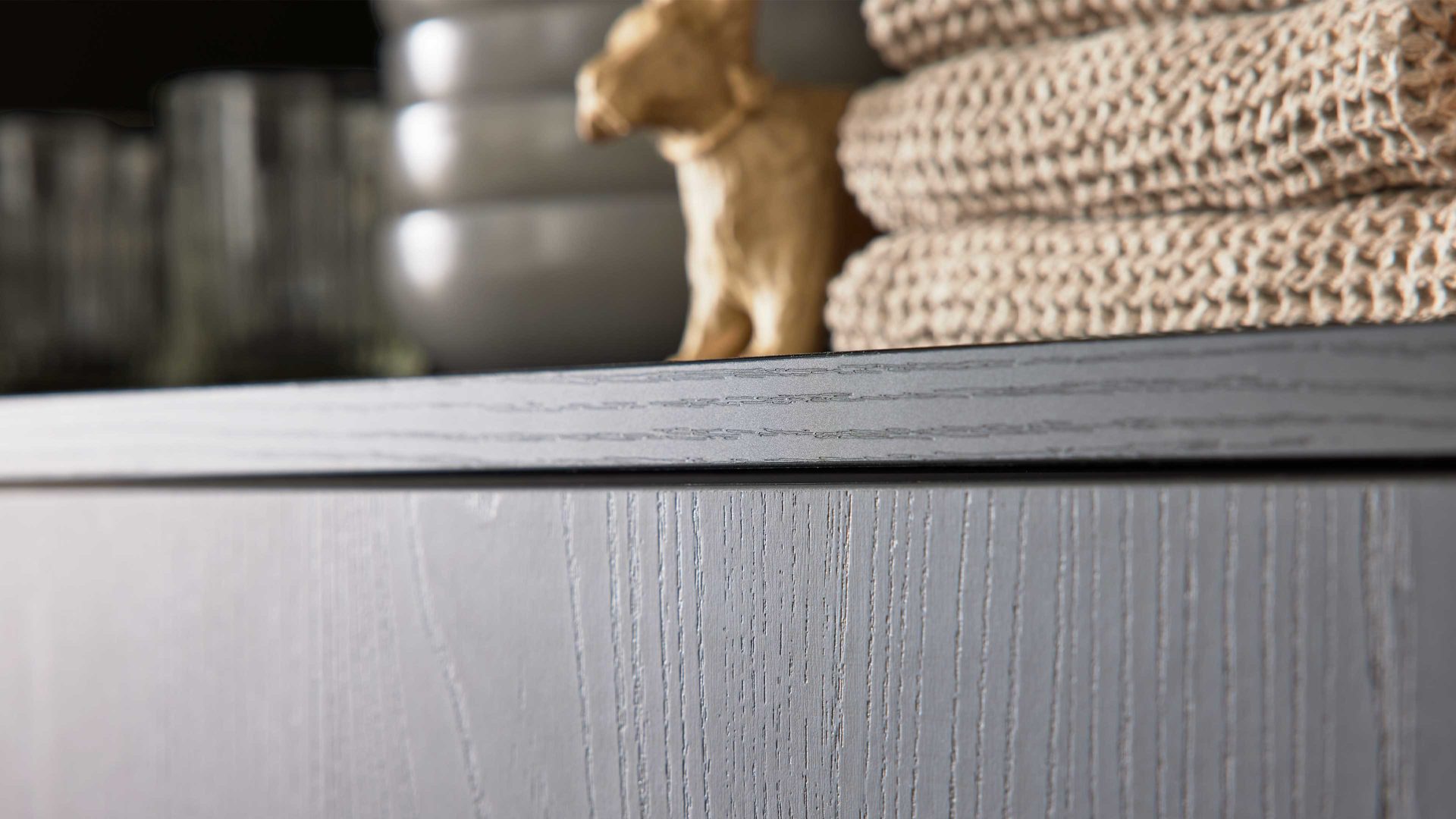 Die Interliving Küche Serie 3056 vereint Eiche-Nero-Nachbildung mit softmattem Platingrau und sorgt so für eine moderne, zugleich wohnliche Ausstrahlung. Schwarze Metallfüße unterstreichen den eleganten Look, während die grifflosen Fronten ein puristisches Design-Statement setzen.