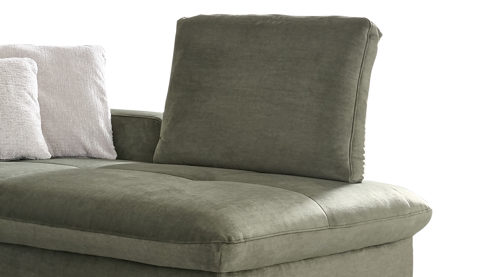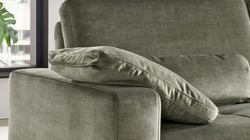 Mit weichem Kaltschaum gepolstert und trendig-olivfarbenem Mikrovelours bezogen, gewährleistet das Kopfpolster die gewünschte Bequemlichkeit und harmoniert perfekt mit den Polstermöbeln im gleichen Design. Das Steckelement besteht aus robustem verchromten Metall.