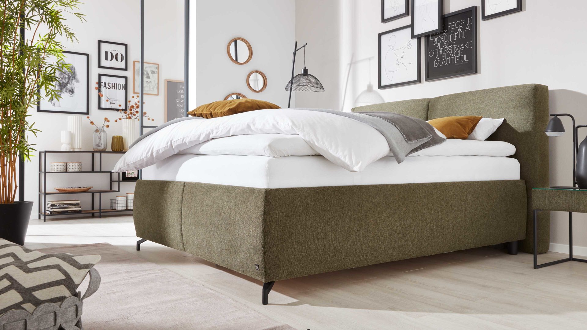 Das Polsterbett aus der Interliving Bettsystem Serie 1414 vereint modernes Design, durchdachte Funktionalität und hohen Schlafkomfort. Der olivgrüne Stoffbezug verleiht dem Bett eine warme, elegante Ausstrahlung und sorgt für ein stilvolles Ambiente im Schlafzimmer. Die schwarzen Metallfüße setzen einen modernen Akzent und erzeugen eine schwebende Optik – ideal, wenn du deinen Staubsaugerroboter mühelos darunter fahren lassen möchtest.