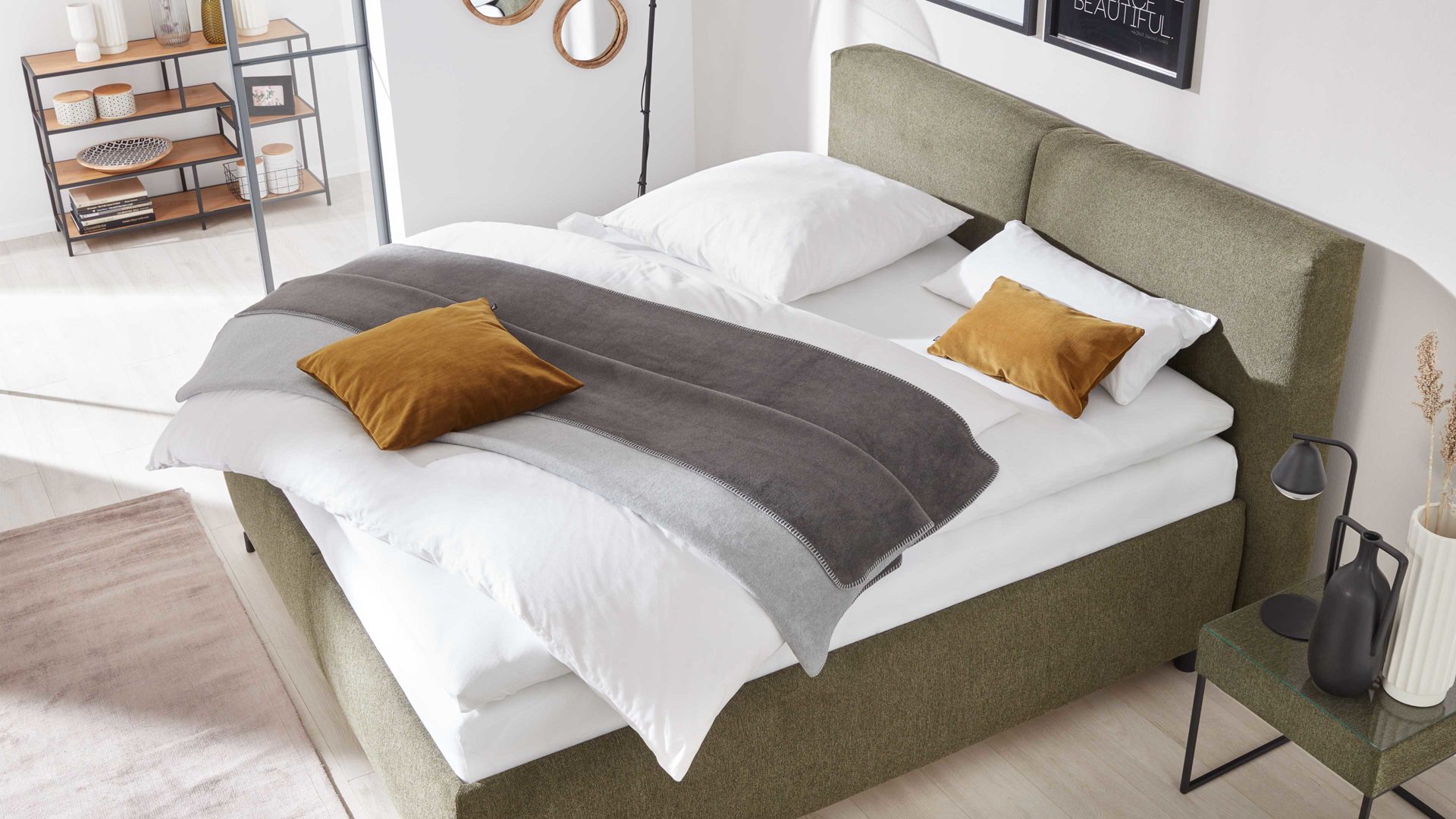 Das Herzstück des Polsterbetts bildet der Bettkasten mit einer rundum stoffbezogenen Außenhülle und einem weiß beschichteten Innenbereich. Besonders praktisch: die integrierte Belüftung, die für optimale Luftzirkulation sorgt und so das Raumklima im Inneren verbessert. Damit eignet sich der Bettkasten ideal zur Aufbewahrung von Kissen, Bettdecken oder saisonaler Kleidung. Hier verbinden sich Design, Funktion und Komfort zu einem perfekt abgestimmten Schlafmöbel, das nicht nur schön aussieht, sondern auch im Alltag überzeugt.