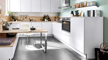 Die nolte® Einbauküche Sigma mit privileg Einbaugeräten begeistert mit den softmatt lackierten Fronten in puristischem Weiß, die teils grifflos, teils mit praktischen Griffmulden versehen sind, und den akzentuierenden Details in Kernbuche-Nachbildung, die warmes Flair verströmen.
