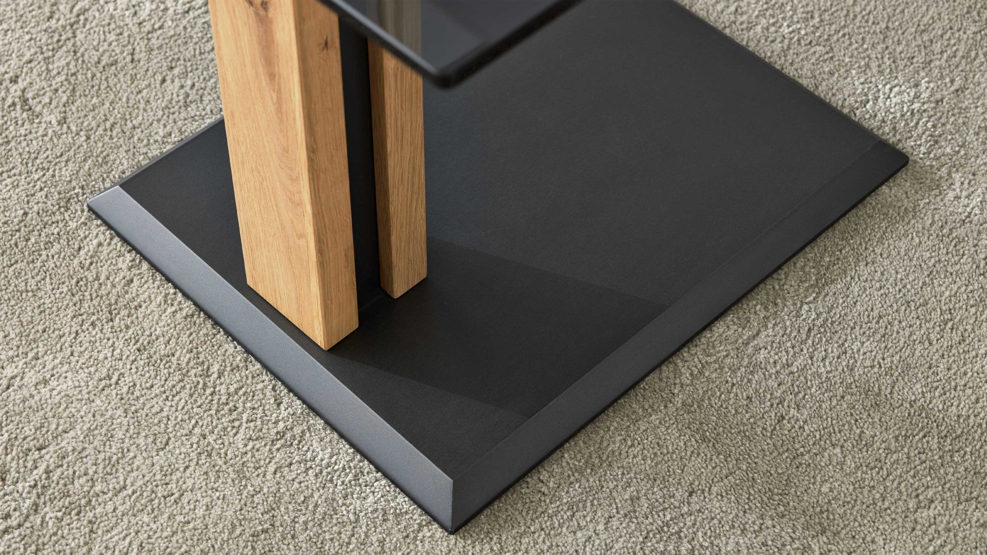 Ein besonderes Highlight ist die 10 mm starke ESG-Glasplatte, eingefasst in einen lackierten Metallrahmen, der dem Tisch eine feine Kontur und zusätzliche Stabilität verleiht. Die Metallelemente und die MDF-Bodenplatte sind anthrazit-metallicfarben lackiert und setzen moderne Akzente, die das hochwertige Erscheinungsbild perfekt abrunden. Durch die Kombination von Glas, Holz und Metall entsteht ein ausgewogener Mix aus Natürlichkeit, Leichtigkeit und industrieller Eleganz.